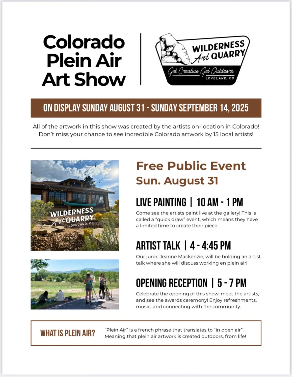 Join us for a day of live artwork and creative community on August 31st from 10am-7pm at Wilderness Art Quarry to celebrate the opening of our First Annual Colorado Plein Air Show!